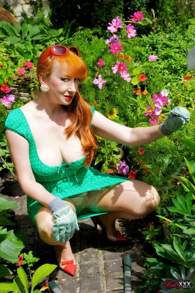 In a lovely tight dress busty redhead Red is looking for some sexy fun on the bed. She loves a good frolic in sheer nylons and stiletto heels! In no time her lush natural titties are on offer and it's panties down, legs open for a good wanking session!