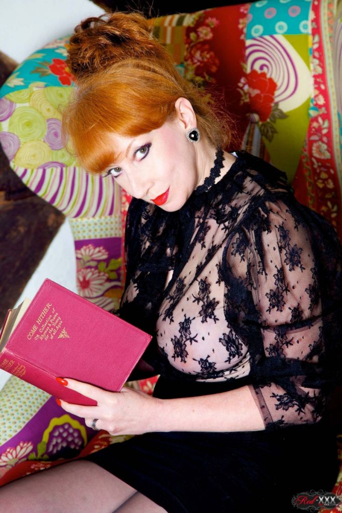 Redhead MILF Katie Davies dressed up in her finest vintage outfit complete with nylons, designer shoes and red hot lingerie