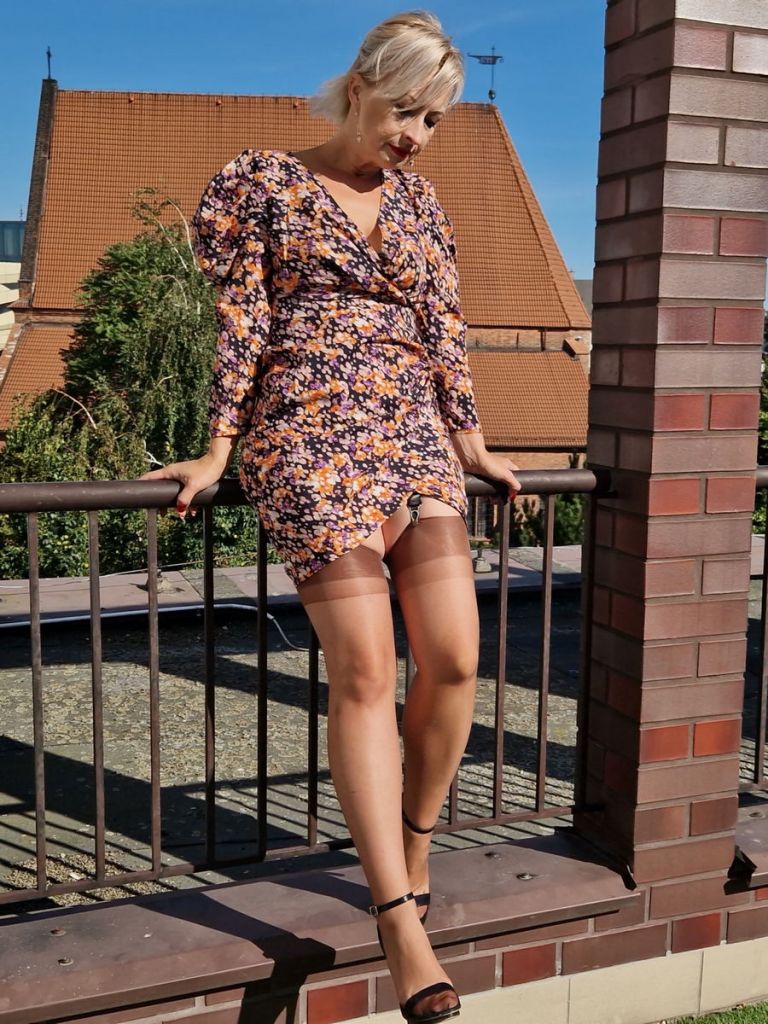 Mature lady Wanilianna in black crotchless pantyhose and glossy seamed stocking almost full nylon encasement and her tits tied with stockings
